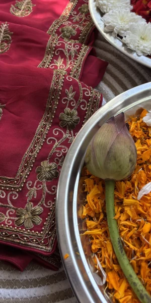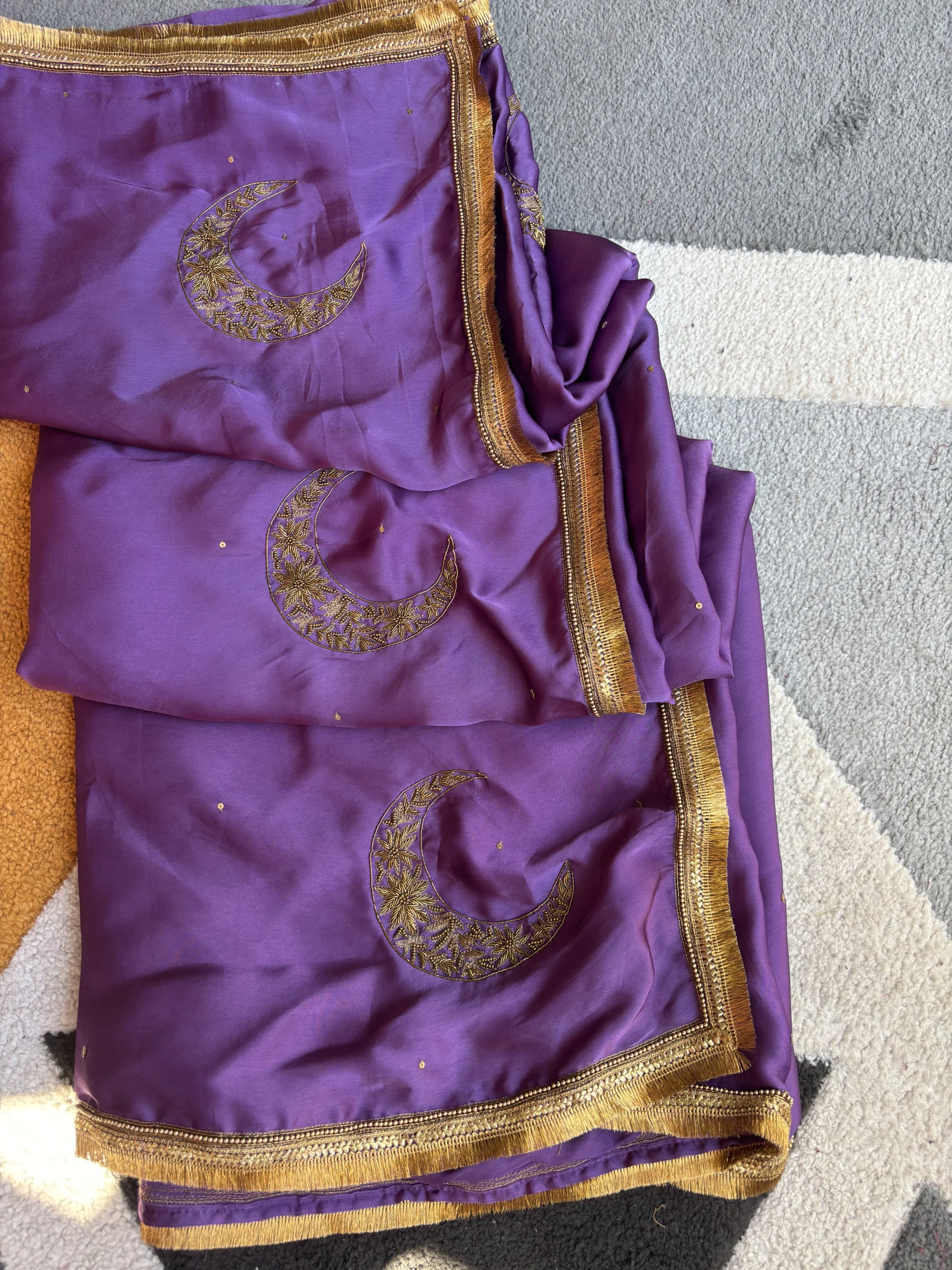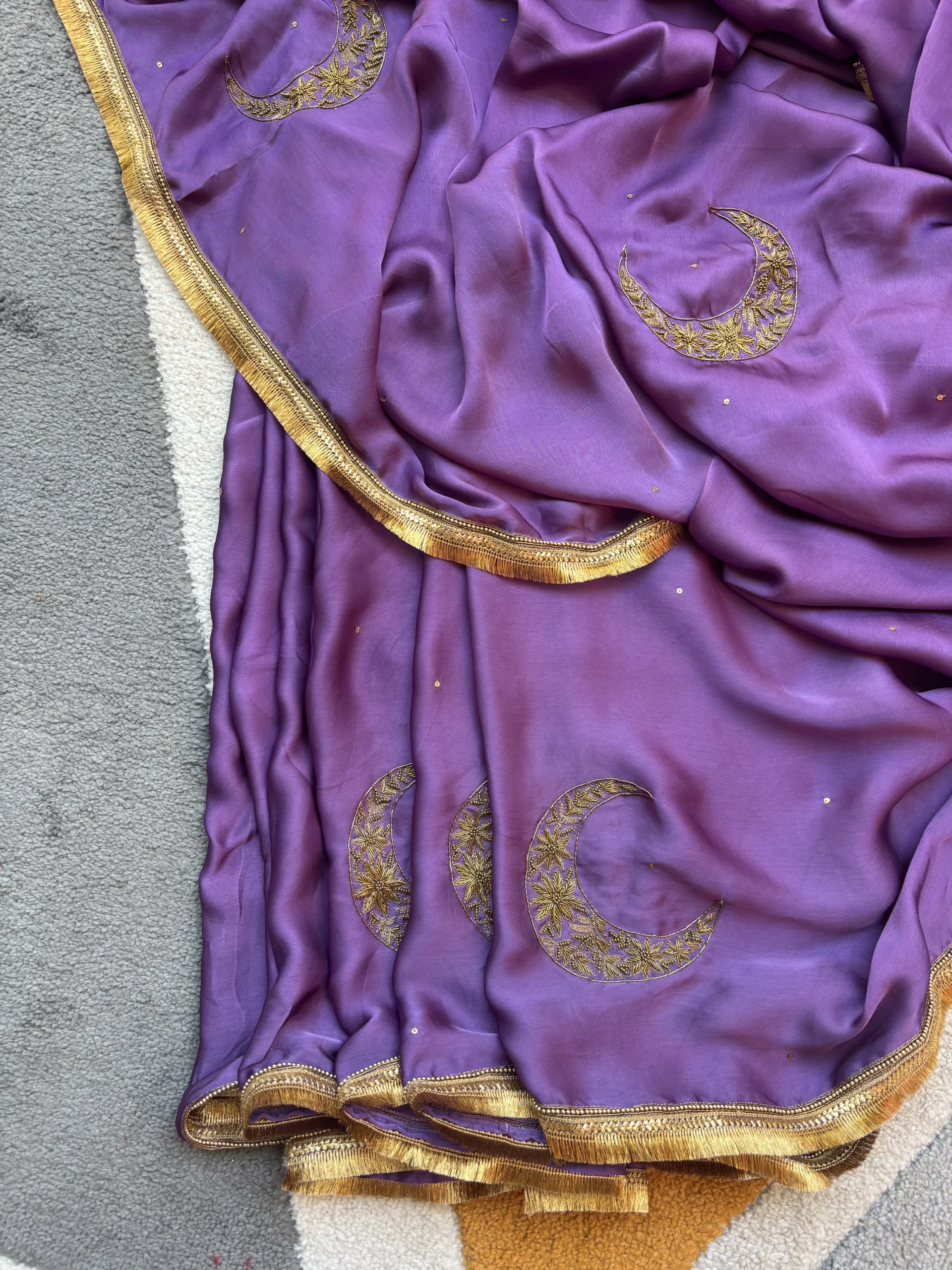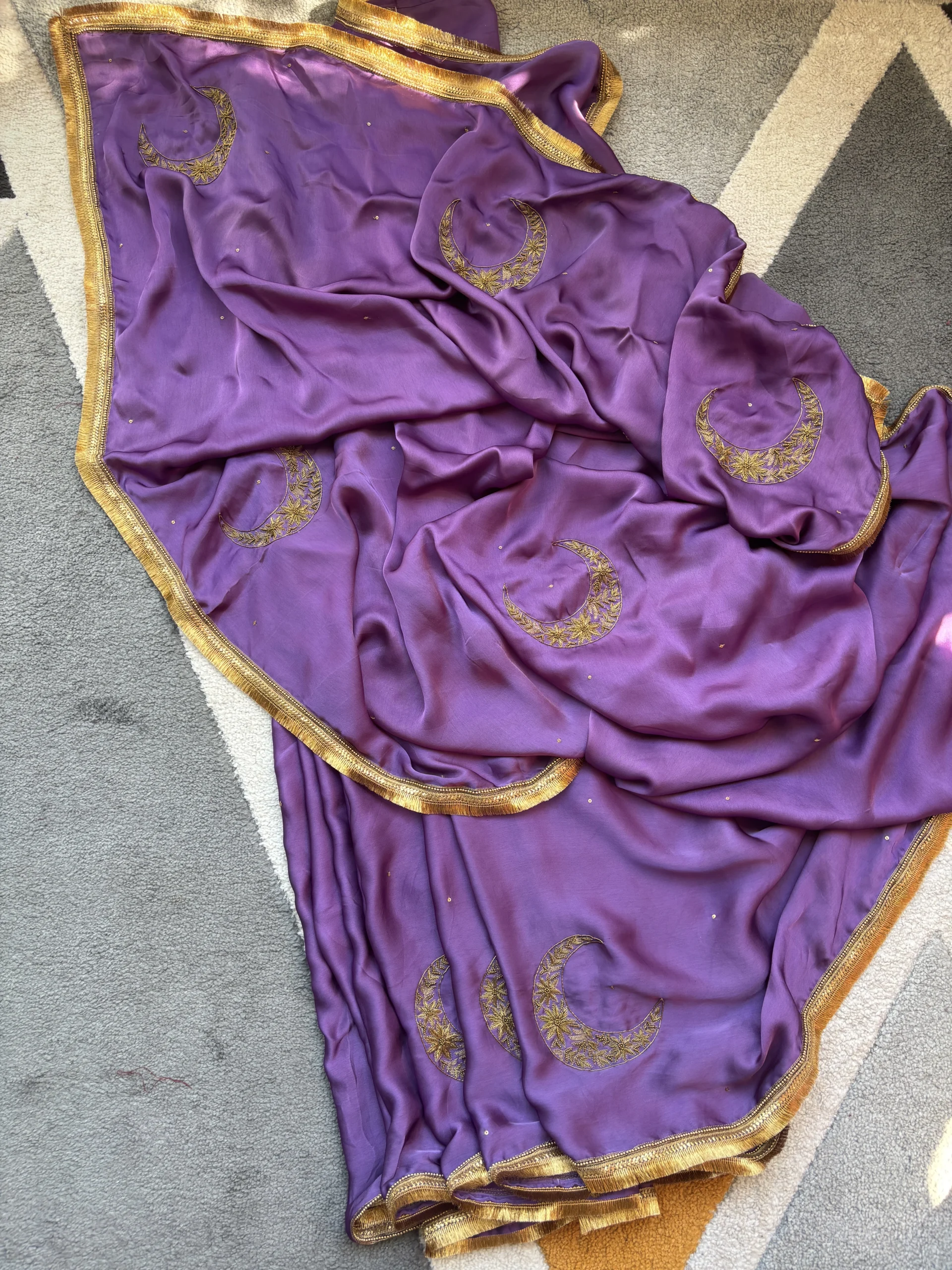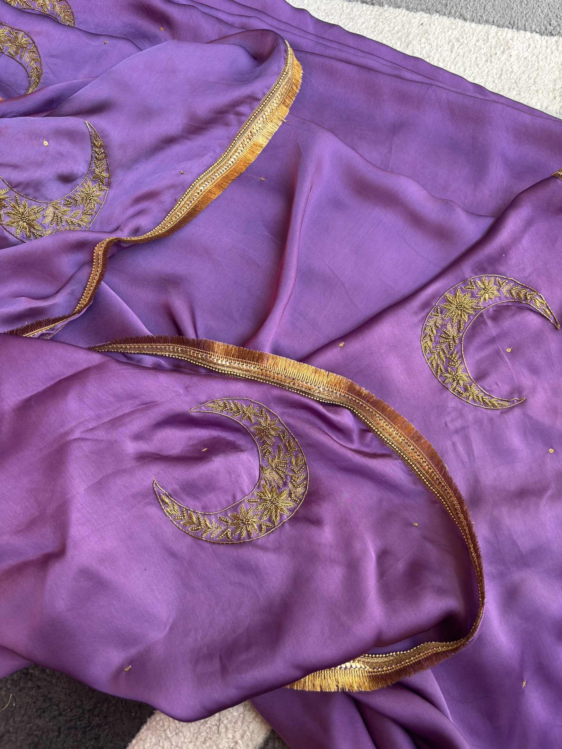 Amara Silk Satin Purple Saree is a graceful blend of elegance and artistry. Crafted in luxurious silk satin, the rich purple hue reflects timeless sophistication. Adorned with delicate hand-embroidered chaand motifs, it carries a subtle celestial charm. Perfect for festive occasions, weddings, and evening celebrations.