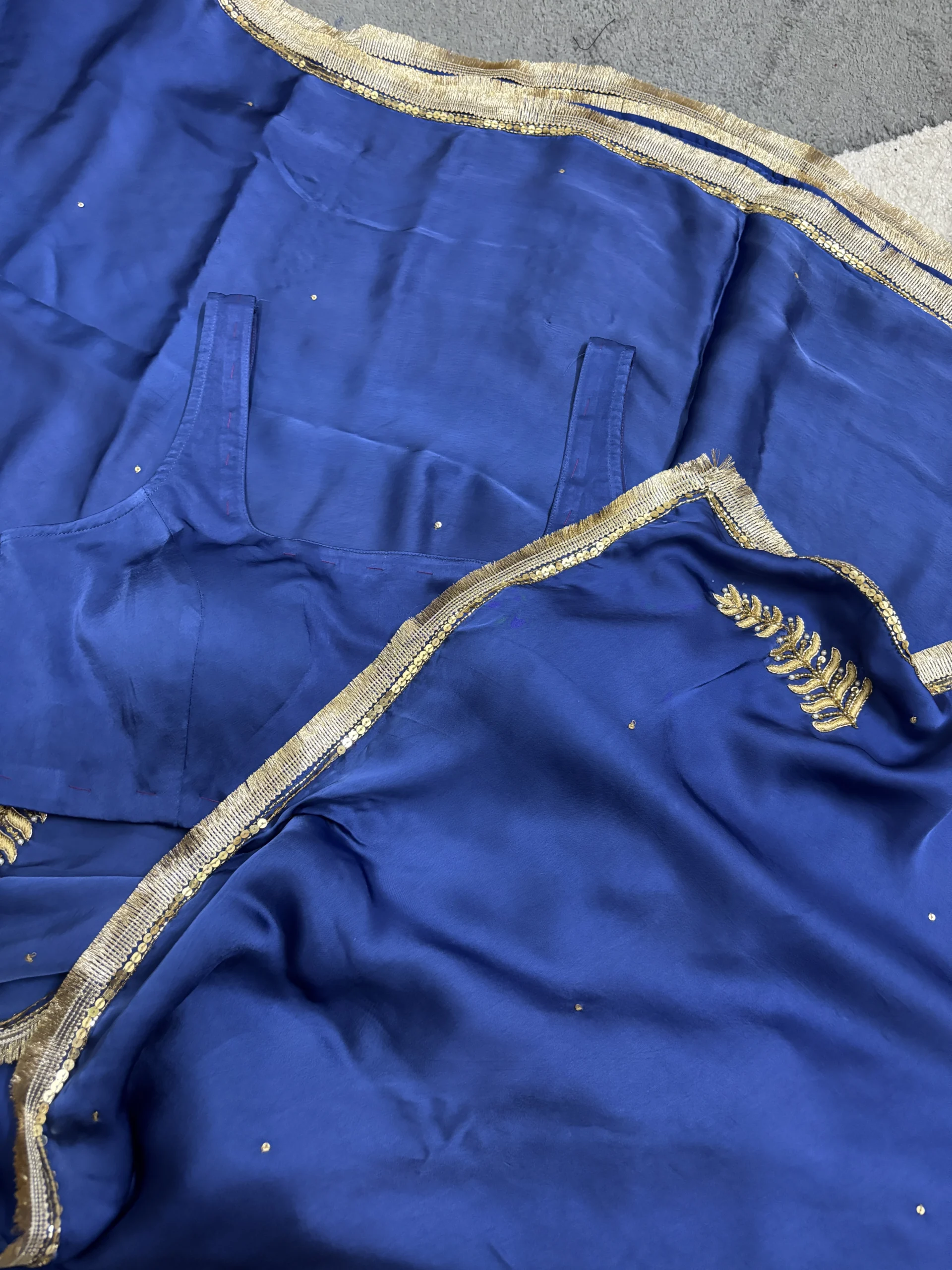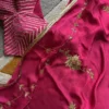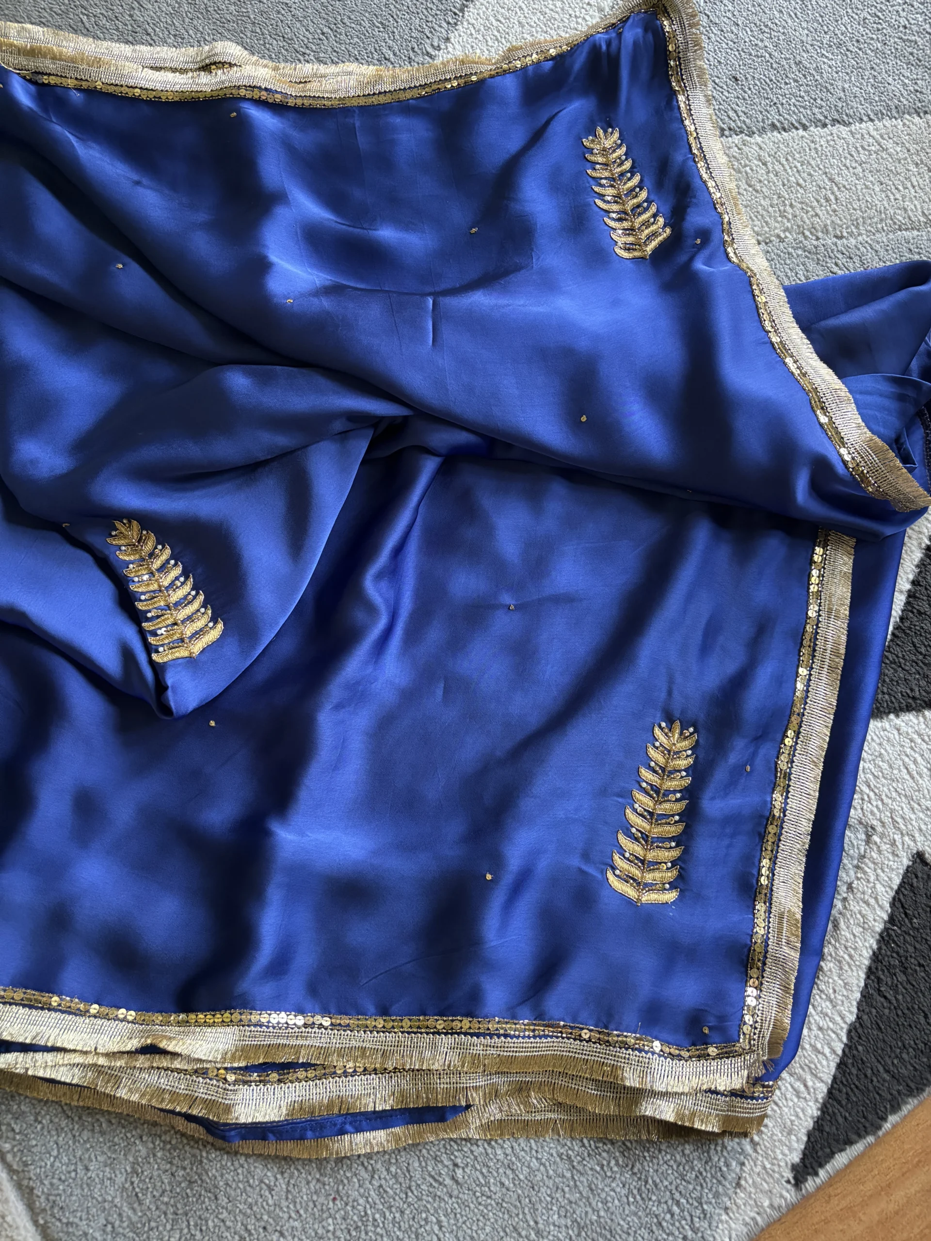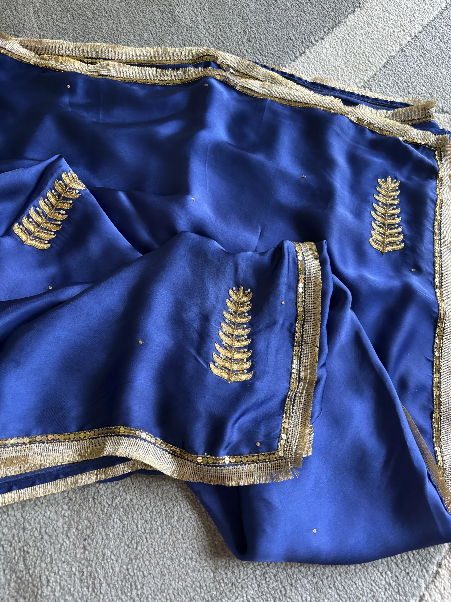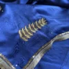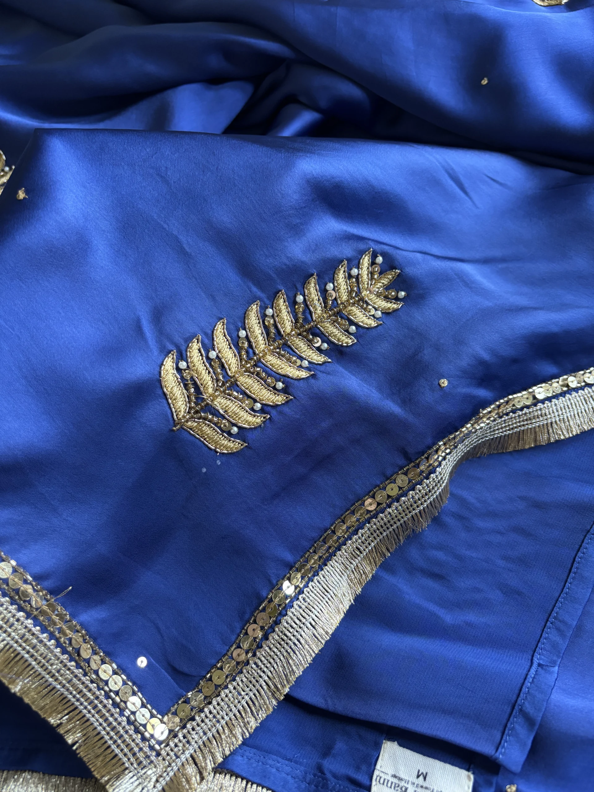 Harini Silk Satin Saree is a graceful blend of elegance and delicate craftsmanship. Made in luxurious silk satin, it features intricate hand-embroidered leaf motifs throughout. The subtle detailing adds a refined, timeless charm to the drape. Perfect for festive occasions, weddings, and elegant celebrations.