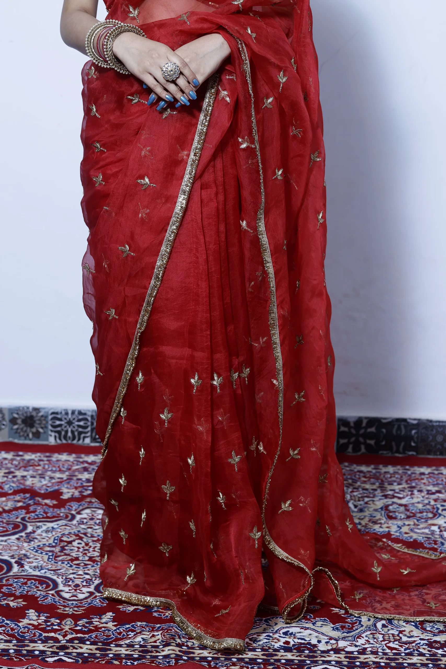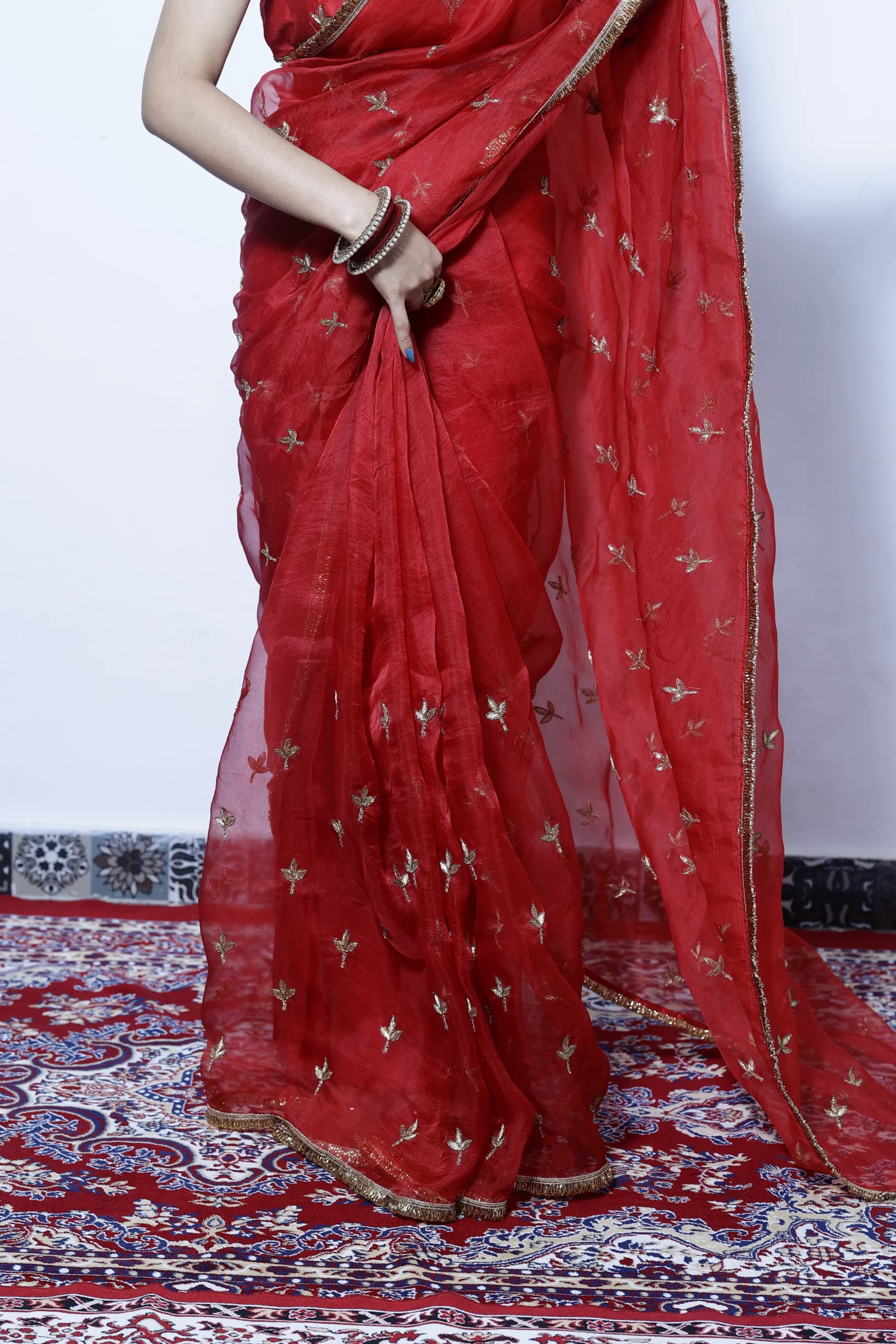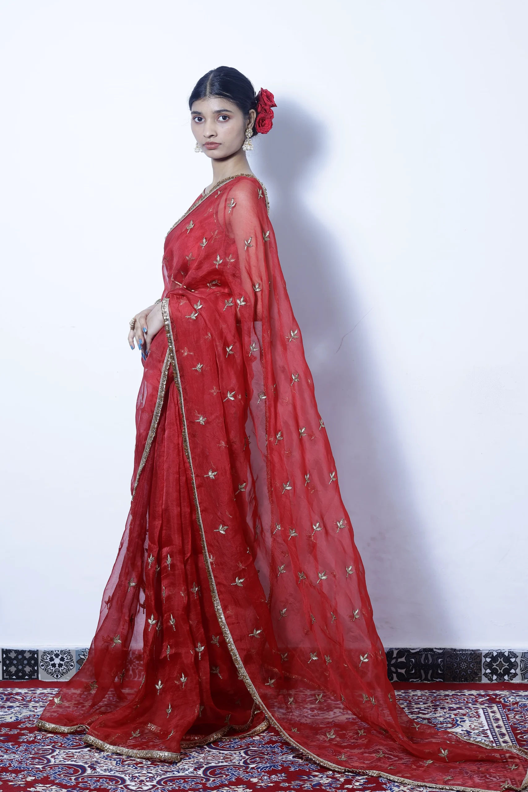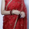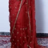 A classic beauty, this vibrant red silk organza saree is delicately embellished with small gold zari motifs. Light, elegant, and timeless, it’s perfect for festive occasions, weddings, and joyful celebrations.