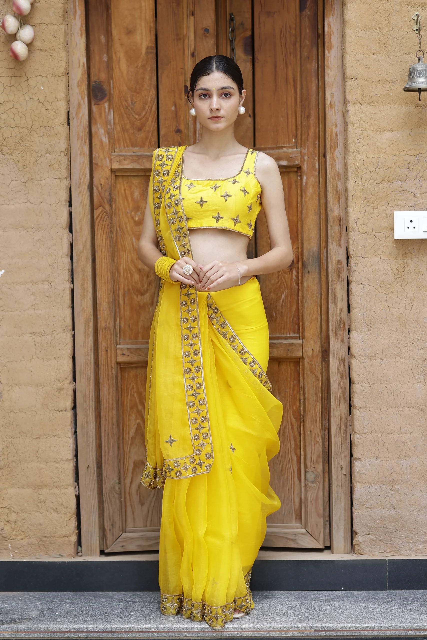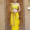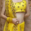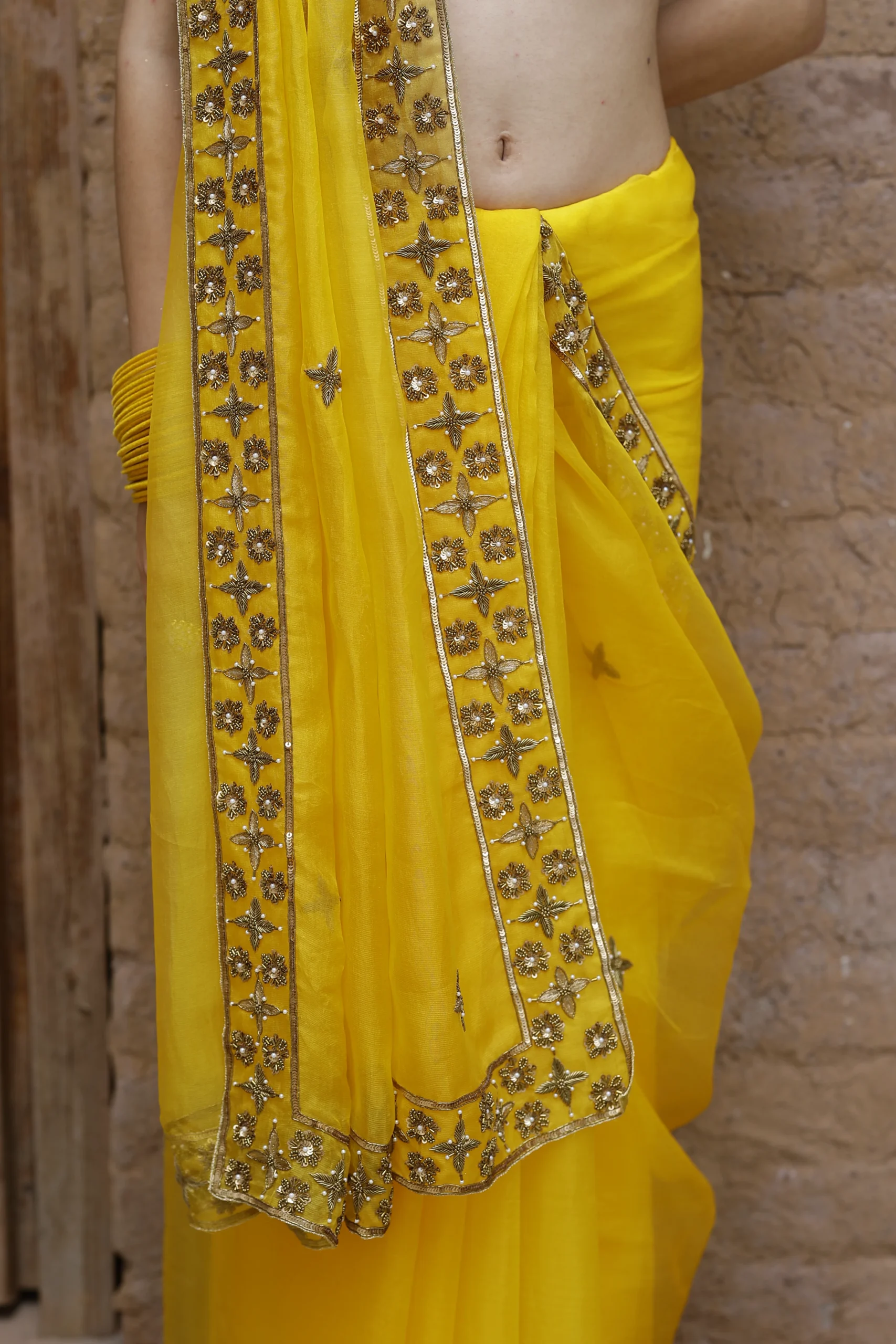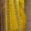 Radiating warmth and festivity, this vibrant yellow silk organza saree is exquisitely adorned with shimmering gold zari embroidery. Light and graceful, it’s a perfect pick for joyous celebrations, haldi ceremonies, and festive gatherings.