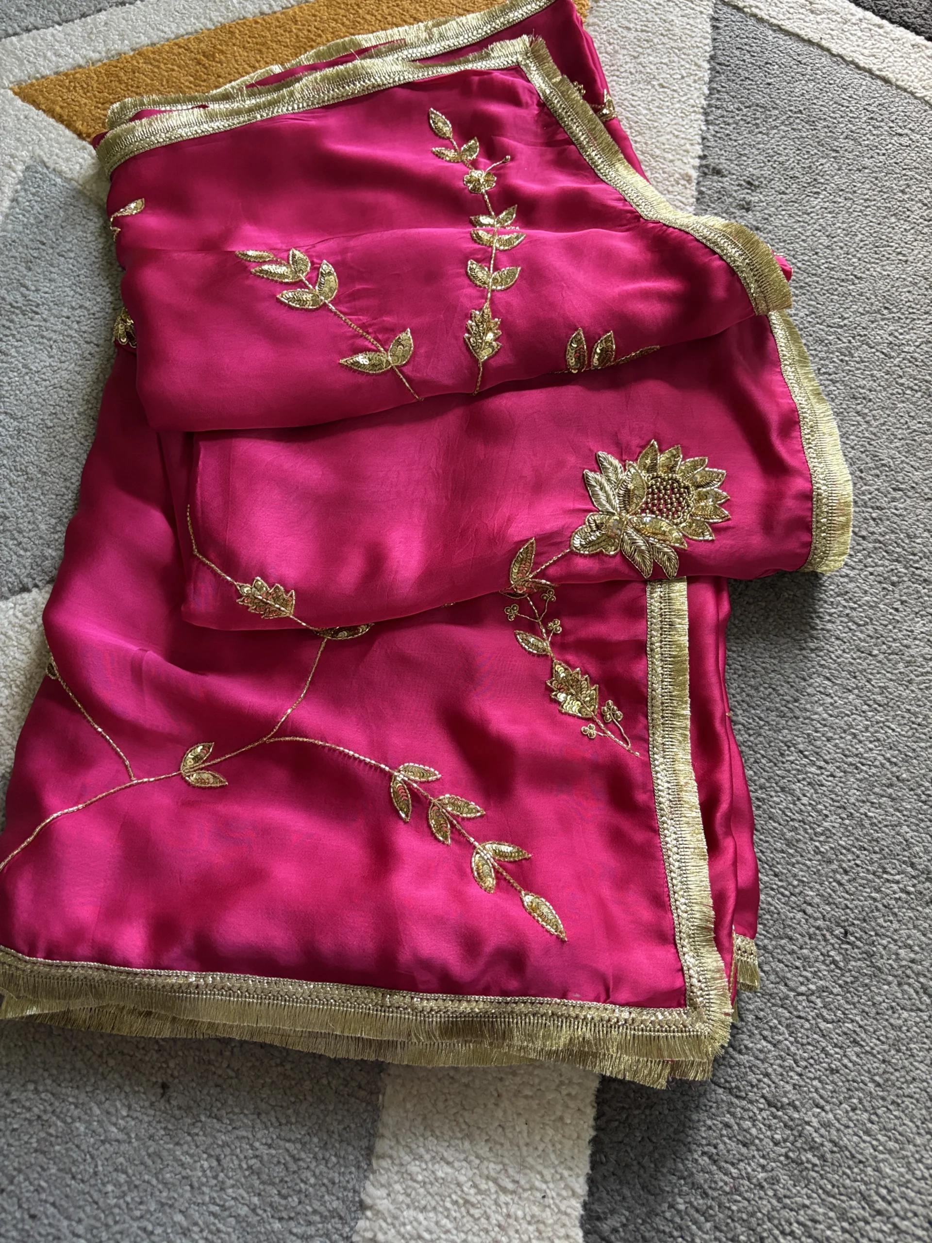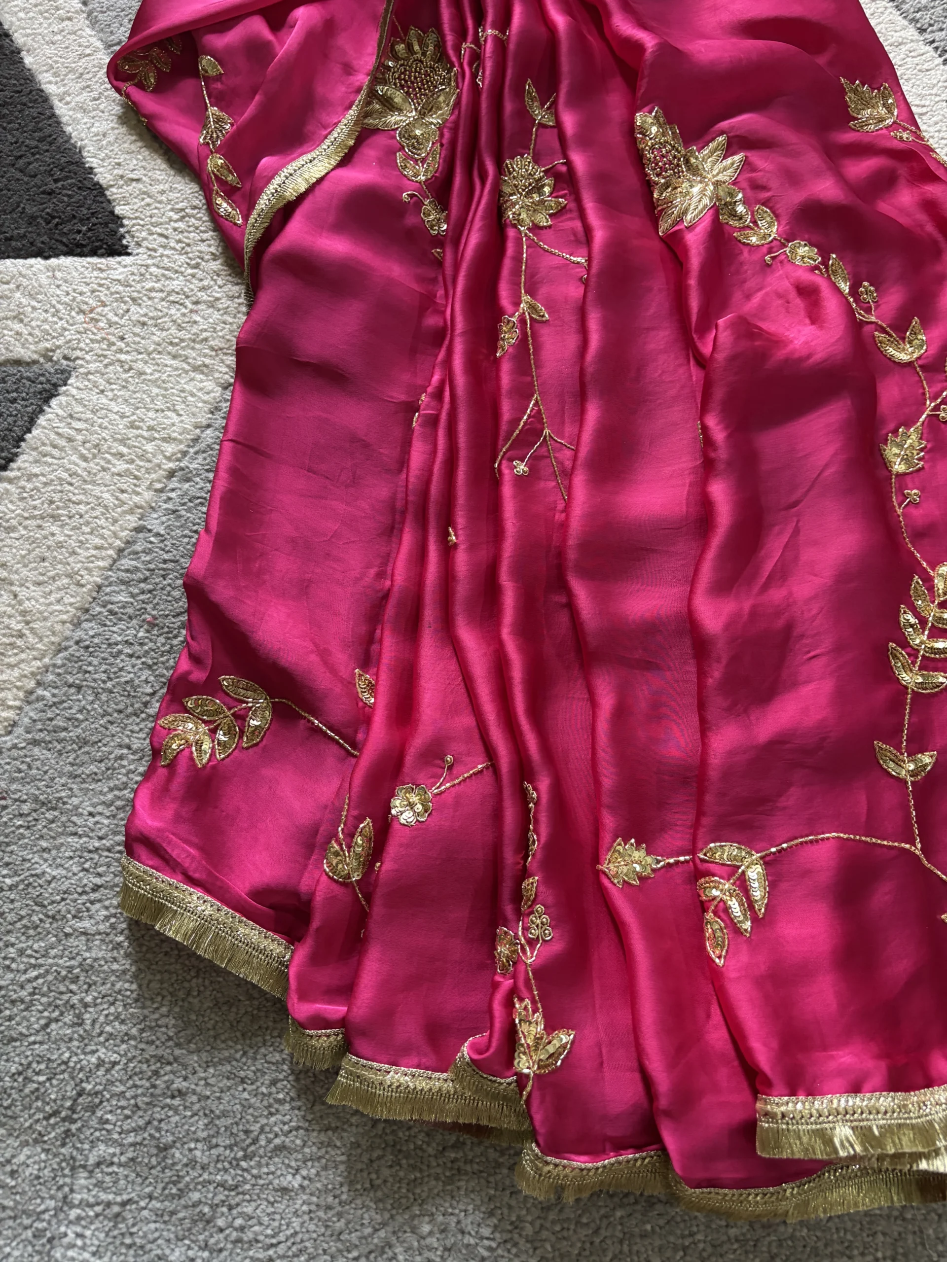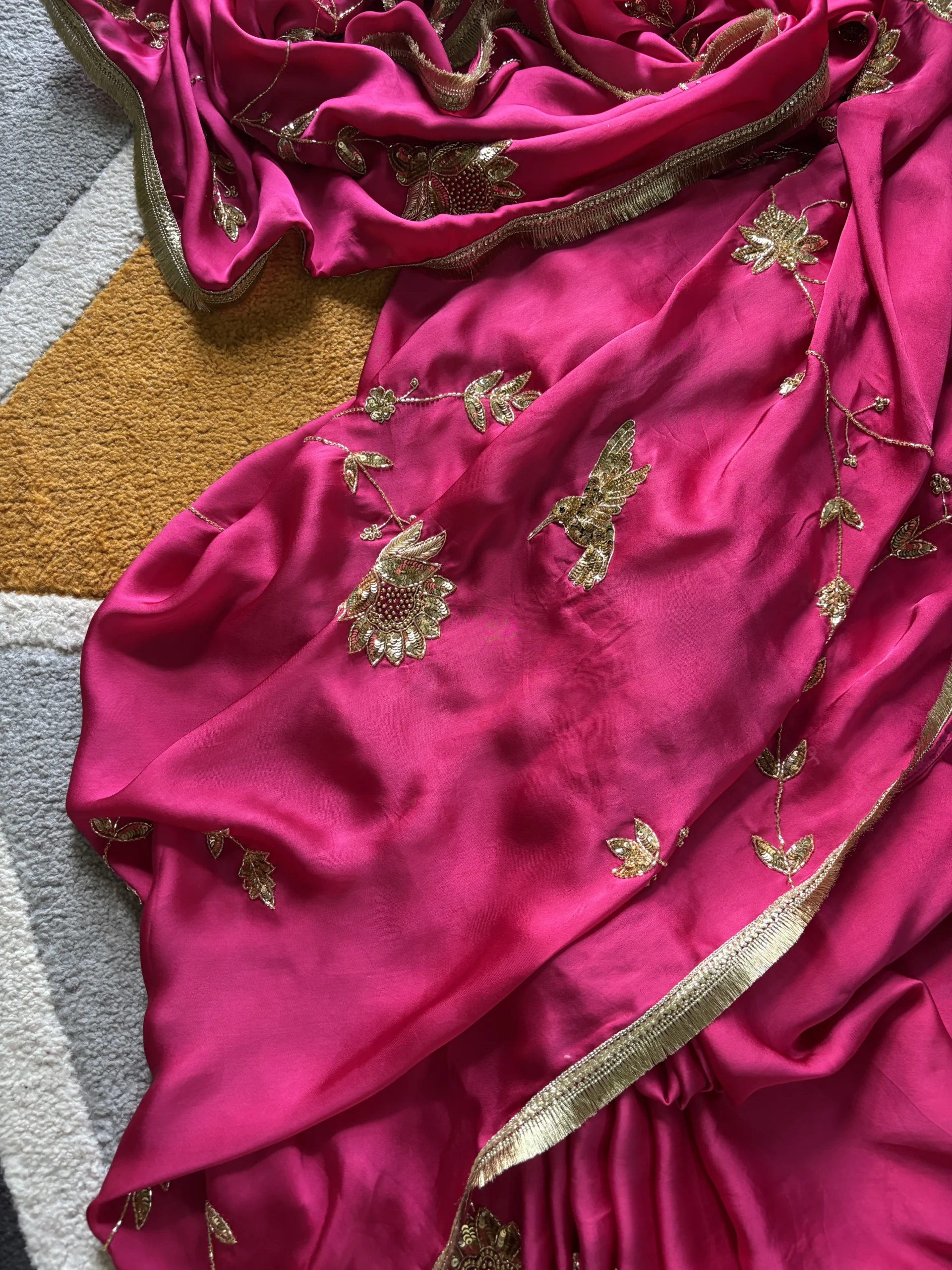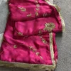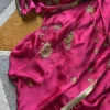 Pankhi Silk Satin Saree is a regal ensemble that blends luxury with intricate craftsmanship. Crafted in rich silk satin, it features exquisite hand-embroidered jhaal work throughout. Paired with a traditional gota blouse, the set exudes festive charm and elegance. Perfect for weddings, special occasions, and grand celebrations.