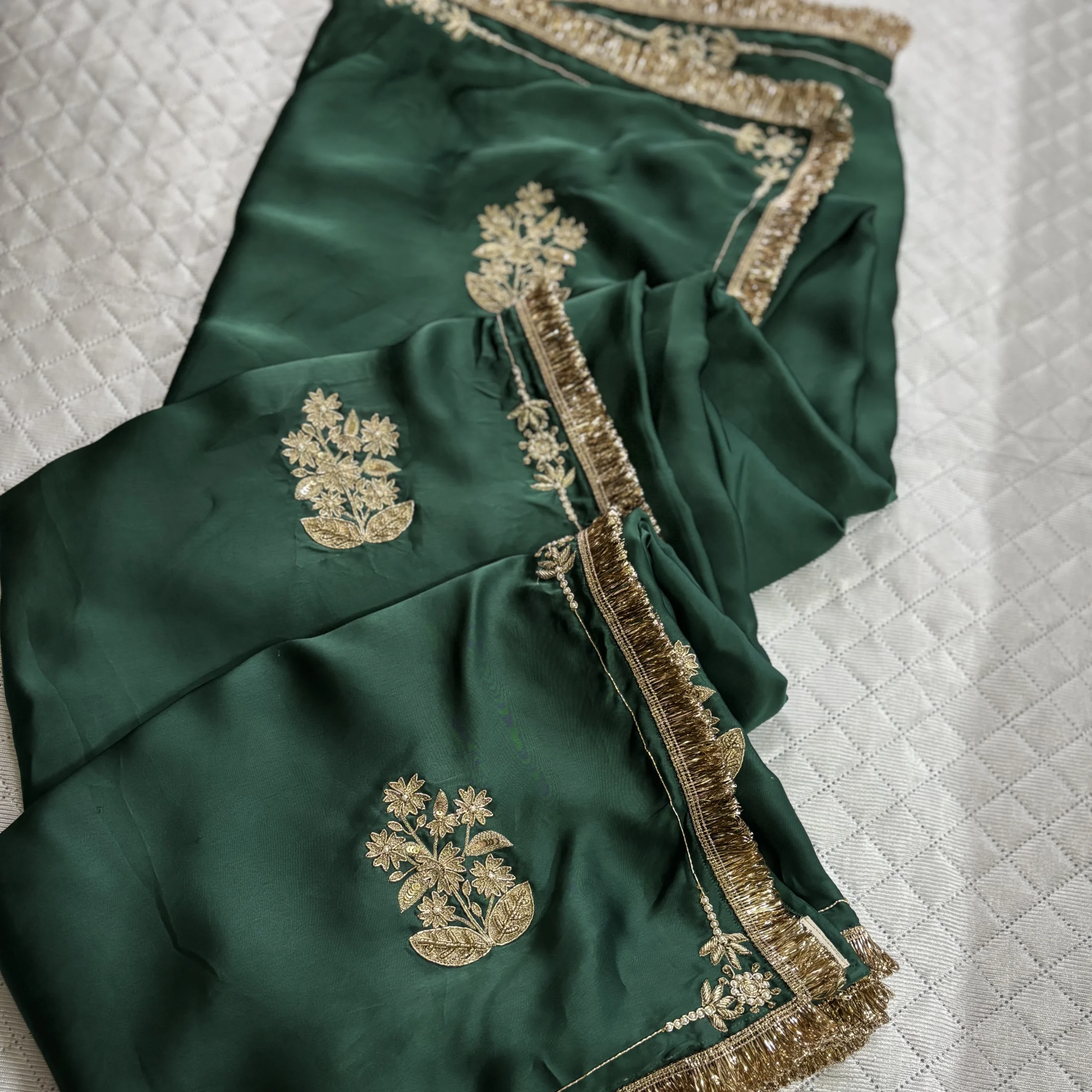 Shaymali Silk Satin Saree is a graceful blend of elegance and subtle detailing. Crafted in luxurious silk satin, it drapes beautifully with a soft sheen. The saree is finished with delicate kiran lace that adds a traditional touch. Perfect for festive occasions, celebrations, and refined evening wear.